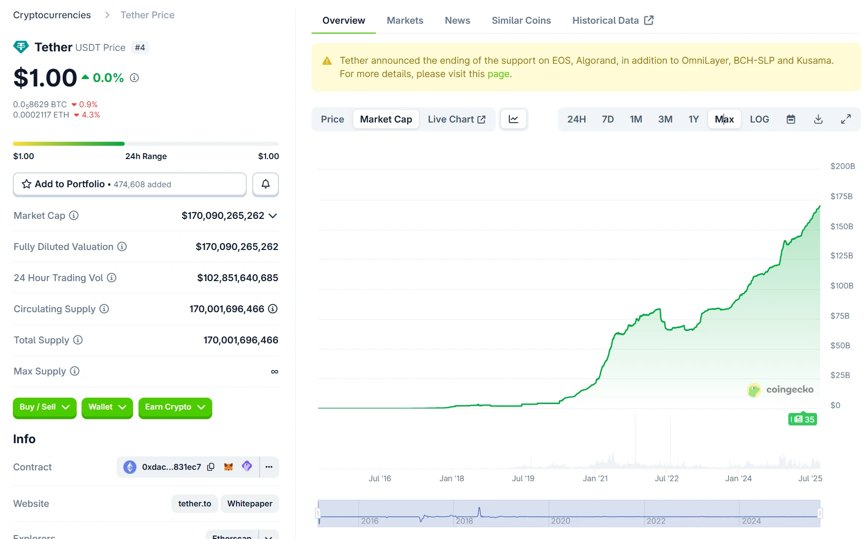 USDT市值突破1700亿美元再创新高 2025-09-13 17:50:46 11 Coingecko数据显示,截至9月13日,USDT市值突破1700亿美元,触及170,090,265,262美元,续创历史新高。 上一篇:Kame Aggregator遭黑客攻击后成功追回185 ETH,补偿计划即将公布 下一篇:Circle亚太区副总裁:人民币稳定币助力人民币国际化 相关文章 BTC价格突破121000美元,再创新高 SOL市值7月21日突破1000亿美元,创近5个月新高 BNB价格突破847美元再创新高 BTC价格突破124000美元再创新高 OKB价格创新高,市值突破50亿美元跃居加密货币第37位 XRP价格突破3美元创历史新高 市值达1814亿美元位列全球第107位 现货黄金价格突破3610美元/盎司再创新高 USDT市值突破1700亿美元再创新高 BNB价格突破940美元再创历史新高 PUMP代币价格创新高 市值突破26亿美元 谷歌市值突破3万亿美元创新高 BNB价格突破1000美元再创新高