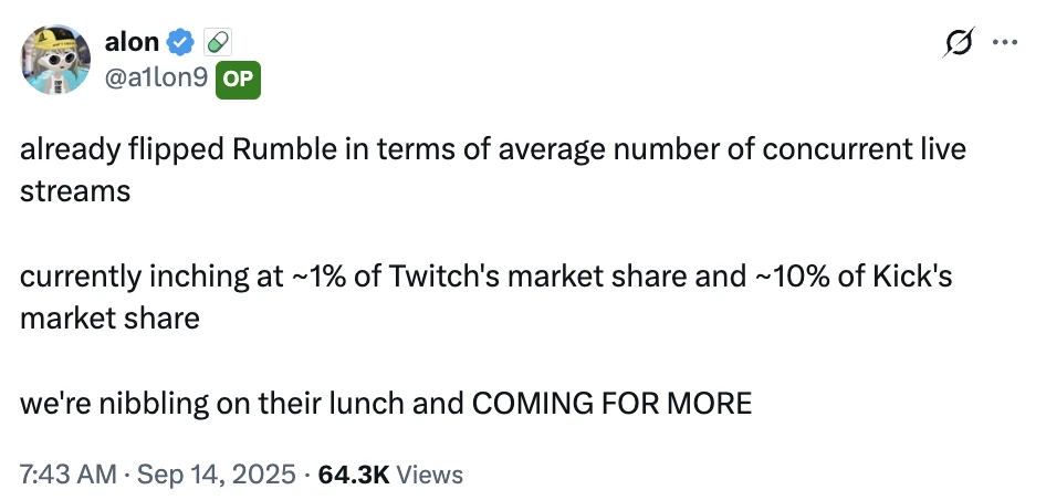 Pump.fun直播数量超越Rumble,PUMP代币价格创新高 2025-09-14 09:39:52 12 Pump.fun创始人alon于9月14日在X平台披露,该平台平均在线直播数量已超过Rumble平台,其市场份额约为Twitch的1%及Kick的10%。同日数据显示,PUMP代币价格今晨突破0.0077美元关口,创下历史新高。 上一篇:Hyperliquid平台巨鲸做空PUMP代币浮亏3500万美元 下一篇:Shibarium跨链桥遭黑客攻击损失240万美元,开发团队紧急冻结BONE代币 相关文章 HYPE代币价格创新高,某鲸鱼5倍杠杆做多持仓未实现获利达1478万美元 BNB价格突破847美元再创新高 BTC价格突破124000美元再创新高 OKB价格创新高 单日涨幅超50% HYPE代币价格创新高 24小时涨幅达11.4% 火币HTX第四期高管直播聚焦C2C交易机制创新 黄金价格创新高推动代币化市场突破25亿美元 黄金价格再创新高 非农数据后大幅上涨 现货黄金价格再创新高,日内涨幅达1% PUMP代币价格创新高 市值突破26亿美元 Pump.fun直播数量超越Rumble,PUMP代币价格创新高 BNB市值创新高,超越英特尔位列全球资产第156位