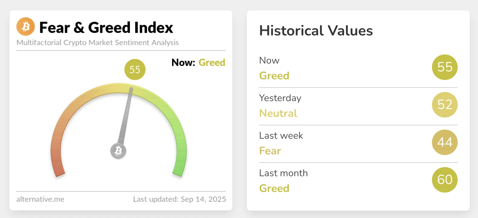 加密货币恐慌与贪婪指数升至55,市场情绪转为贪婪状态 2025-09-14 10:14:50 13 9月14日,Alternative.me数据显示加密货币恐慌与贪婪指数当日飙升至55,较前日的52实现增长,市场情绪同步从“中性状态”切换至“贪婪状态”。 上一篇:巨鲸大额转出SOL并兑换USDC,同时持有大量BTC 下一篇:Galaxy Digital五小时增持32.5万枚SOL,价值7800万美元 相关文章 加密货币恐慌与贪婪指数升至72 市场持续贪婪状态 加密货币恐慌与贪婪指数降至55 市场仍处贪婪状态 加密货币恐慌与贪婪指数升至64,市场情绪转为贪婪 加密货币恐慌与贪婪指数升至62,市场转为贪婪状态 加密货币恐慌与贪婪指数升至69,市场持续贪婪状态 加密货币恐慌与贪婪指数升至73,市场持续贪婪状态 加密货币恐慌与贪婪指数升至64,市场持续贪婪状态 加密货币恐慌与贪婪指数升至50,市场情绪转为中性 加密货币恐慌与贪婪指数降至46,市场情绪转为恐慌 加密货币恐慌与贪婪指数升至55,市场情绪转为贪婪 加密货币恐惧与贪婪指数升至57,市场情绪转为贪婪状态 加密货币恐慌与贪婪指数升至55,市场情绪转为贪婪状态