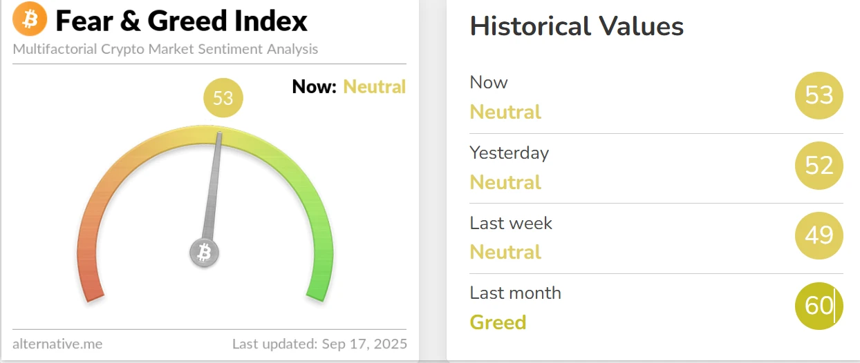 加密货币恐慌与贪婪指数小幅攀升至53,市场情绪维持中性 2025-09-17 09:18:17 16 加密货币恐慌与贪婪指数9月17日升至53,较前日52小幅攀升,市场情绪维持中性水平。 上一篇:Cathie Wood旗下Ark Invest增持Bullish股票逾827万美元 下一篇:链上分析师监测:某鲸鱼向Kraken交易所转入2600枚ETH 相关文章 加密货币恐慌与贪婪指数升至74,市场情绪维持贪婪区间 加密货币恐慌与贪婪指数降至73 市场情绪维持贪婪状态 加密货币恐慌与贪婪指数升至50,市场情绪转为中性 加密货币恐慌与贪婪指数连续两日维持50 市场情绪保持中性 加密货币恐慌与贪婪指数降至53,市场情绪转为中性 加密货币恐惧与贪婪指数下滑至47,市场情绪维持中性 加密货币恐慌与贪婪指数报50 市场情绪维持中性状态 加密货币恐慌与贪婪指数降至51,市场情绪转为中性 加密货币恐慌与贪婪指数9月5日降至48,市场情绪维持中性 加密货币恐慌与贪婪指数降至53 市场情绪转为中性 加密货币恐慌与贪婪指数微跌至52,市场情绪维持中性 加密货币恐慌与贪婪指数小幅攀升至53,市场情绪维持中性
