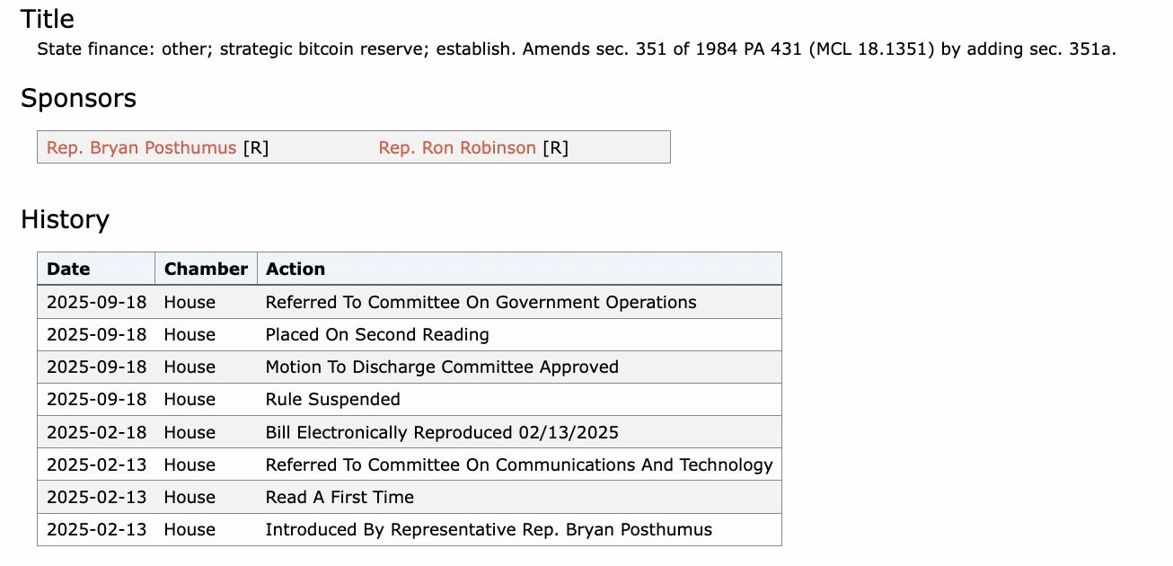 密歇根州比特币储备法案HB 4087进入众议院二读阶段 2025-09-19 12:46:51 14 密歇根州比特币储备法案HB 4087于9月19日取得新进展,自2月以来首次进入众议院二读阶段,并提交至政府运营委员会审议。法案内容显示,州政府可将不超过10%的州资金配置于加密货币资产。 上一篇:Pump.fun平台直播数据公布:活跃主播930位,平均观众9人 下一篇:TWT代币日内大涨36%至1.08美元,CZ称其应用场景持续扩展 相关文章 美国众议院7月2日召开会议讨论参议院’大而美’法案 特朗普称众议院计划当晚表决税改法案 大而美法案通过美国众议院程序性表决 美国众议院通过”大而美”税收与支出法案 美国众议院加密货币周将审议三项法案 DeFi社区推动关键条款恢复 美国众议院计划就三项加密法案进行投票 美国众议院推进加密货币监管法案 GENIUS稳定币法案或提交特里斯普签署 美国众议院全数通过三项加密法案 比特币进入第二阶段上升中枢震荡 市场多空分歧明显 美国众议院将反CBDC法案纳入国防法案强制条款 加密行业代表齐聚华盛顿共推比特币储备法案 密歇根州比特币储备法案HB 4087进入众议院二读阶段