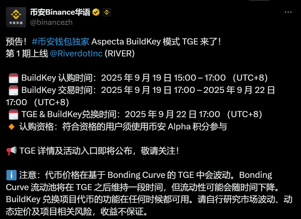 River官方公布BuildKey TGE参与规则及时间安排 2025-09-19 14:10:30 10 River官方公布BuildKey TGE参与规则:第一阶段(充值)需至少209 Alpha积分并消耗15积分,第二阶段(交易)需至少61 Alpha积分且不扣除积分。时间安排如下:认购期为2025年9月19日15:00-17:00(UTC+8);交易期持续至9月22日17:00(UTC+8);TGE及兑换时间定于9月22日17:00(UTC+8)。 上一篇:pump.fun App日活用户数90天内激增450% 下一篇:梁仲贤:欧美主导衍生品创新 亚洲市场潜力显著 相关文章 俄罗斯央行公布数字卢布全国推广时间表 Sonic公布第一季S代币空投申领时间 币安公布 BOOM TGE 活动参与规则:Alpha 积分需达 200 WLFI官方澄清:团队及顾问代币无上线解锁安排 币安Alpha公布新一轮空投规则 AKEDO(AKE)TGE参与规则公布:需238分Alpha积分,每次扣除15积分 币安钱包公布Mitosis(MITO)代币TGE时间及参与方式 OKX公布WLFI上线时间表:充币、交易及合约转换安排 币安公布Quack AI空投规则及交易时间表 Aster平台公布TGE时间及空投申领安排 OKX宣布推迟LINEA上线时间并公布具体交易安排 River官方公布BuildKey TGE参与规则及时间安排