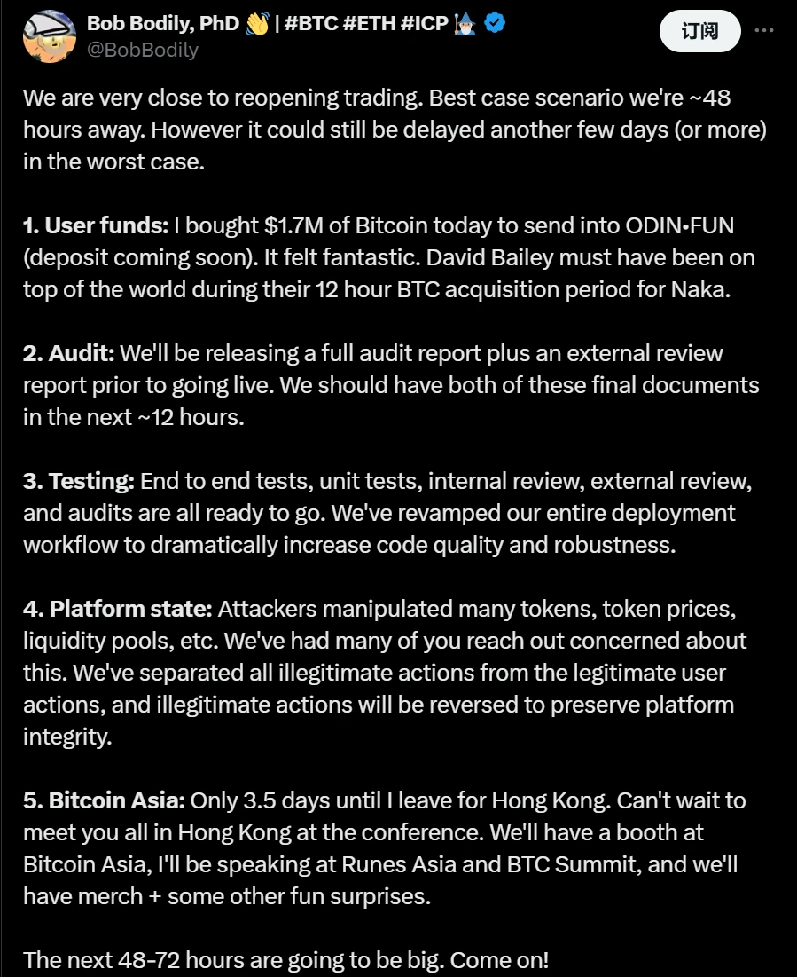 Odin.fun平台预计最快48小时内恢复交易 完成比特币资金补充及安全审计 2025-08-21 15:04:56 26 Odin.fun联合创始人Bob Bodily于8月21日披露,该平台预计最快48小时内重启交易,延期上限为数日。平台已斥资170万美元购入比特币补充流动性,相关资金即将到账。官方同步披露,完整审计报告及外部评估将于12小时内公布,所有代码测试与审查工作已完成。针对此前攻击事件,异常交易行为已与正常用户操作完成分离,平台将执行回滚操作以保障用户资产安全。 上一篇:鲸鱼两小时抛售YZY代币亏损50万美元 下一篇:Hotcoin热币交易所宣布上线ARIA/USDT交易对及平台代币信息 相关文章 Thesis完成对比特币奖励平台Lolli的收购 能源电动汽车公司Nuvve完成480万美元增发,拟配置HYPE代币及比特币储备 比特币交易平台安全与成本全面对比分析 比特币杠杆交易平台深度解析与风险应对策略 加密货币交易平台安全与合规性深度分析 Galaxy完成加密货币史上最大比特币交易之一 涉及8万枚比特币 比特币与以太坊交易所资金流向呈现显著分化 Odin.fun平台预计最快48小时内恢复交易 完成比特币资金补充及安全审计 币安U本位合约交易问题修复完成,服务全面恢复 加密货币市场24小时爆仓3.48亿美元,比特币以太坊损失居前 比特币矿工向交易平台转入价值达历史峰值 不丹政府转移343.1枚比特币,预计存入中心化交易所