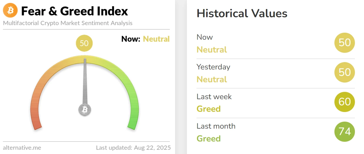 加密货币恐慌与贪婪指数连续两日维持50 市场情绪保持中性 2025-08-22 09:10:49 24 Alternative.me数据显示,8月22日加密货币恐慌与贪婪指数连续两日报50,表明市场情绪维持中性区间。 上一篇:美联储9月降息概率达75% 10月或进一步降息 下一篇:用户遭社会工程骗局损失783枚比特币 相关文章 加密货币恐慌与贪婪指数升至74,市场情绪维持贪婪区间 加密货币恐慌与贪婪指数降至73 市场情绪维持贪婪状态 加密货币恐惧与贪婪指数连续两日攀升,市场维持贪婪状态 加密货币恐慌与贪婪指数升至50,市场情绪转为中性 加密货币恐慌与贪婪指数连续两日维持50 市场情绪保持中性 加密货币恐慌与贪婪指数报50 市场情绪维持中性状态 加密货币恐慌与贪婪指数降至51,市场情绪转为中性 加密货币恐慌与贪婪指数9月5日降至48,市场情绪维持中性 加密货币恐慌与贪婪指数连续多日维持中性区间 加密货币恐慌与贪婪指数降至53 市场情绪转为中性 加密货币恐慌与贪婪指数微跌至52,市场情绪维持中性 加密货币恐慌与贪婪指数小幅攀升至53,市场情绪维持中性