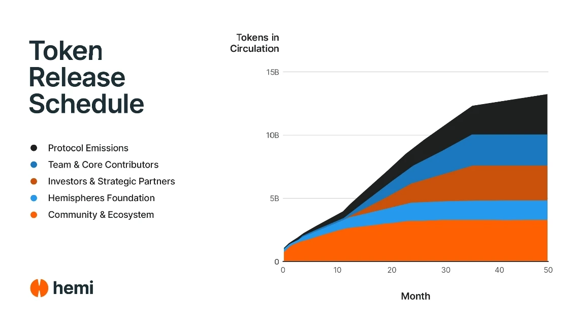 Hemi区块链公布代币经济学方案及融资情况 2025-08-22 10:57:47 28 模块化L2区块链网络Hemi于8月22日披露代币经济学方案,HEMI代币总量锁定100亿枚,分配结构为:团队及核心贡献者占25%;Hemispheres基金会占15%;社区及生态占32%;投资人及战略伙伴占28%。该网络开发方Hemi Labs曾在2024年9月完成1500万美元融资,由YZi Labs(原Binance Labs)等机构领投。 上一篇:Bitget Wallet与Base生态深度合作,集成Aerodrome并扩展PayFi支付 下一篇:Amberdata分析师解析比特币与以太坊市场前景 相关文章 Linea 计划7月底公布代币经济学及治理方案 Hyperion (RION) 公布代币经济学:空投占5%、社区激励占5% 去中心化数据平台Sapien公布代币经济学:10亿总量分配方案揭晓 Towns Protocol公布代币经济学:TOWNS代币总量100亿枚,逾10%将于8月5日空投 MEET48公布IDOL代币销毁计划,区块链技术重塑偶像产业新纪录 Hemi区块链公布代币经济学方案及融资情况 Bitlayer发布BTR代币经济学方案 总供应量10亿枚 Bitlayer代币BTR空投计划启动及代币经济学公布 互操作性协议Union公布U代币经济学 初始发行量100亿枚 Aster项目公布$ASTER代币经济学模型 Anoma公布代币经济学分配方案:总供应量100亿枚 预言机协议Switchboard公布代币经济学模型及币安Alpha上线计划