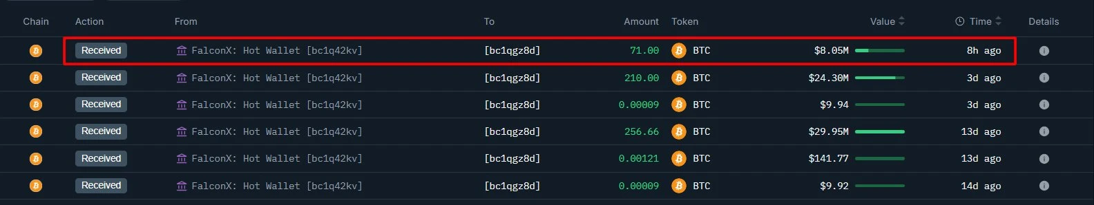 某巨鲸地址8小时前从FalconX接收71枚比特币,两周累计增持超537枚 2025-08-22 12:49:13 22 链上分析师Onchain Lens(@OnchainLens)监测显示,某巨鲸地址于8月22日8小时前从FalconX平台接收71枚比特币,价值805万美元。该地址近两周累计增持537.66枚比特币,总价值约6085万美元。 上一篇:欧盟加速数字欧元研发计划调整 下一篇:香港启动2025施政报告咨询 普华永道建议加速数字资产战略 相关文章 巨鲸地址5小时前完成32.71枚WBTC清仓操作 获利6.8万美元 比特币远古巨鲸10小时前转移1万枚BTC 比特币远古巨鲸三小时前向新地址转移9999枚BTC,价值11.9亿美元 三位巨鲸五日内累计增持超15万枚ETH 巨鲸/机构地址增持3400万美元ETH 近20日累计购入21,571枚 巨鲸五小时前提取500枚比特币 三个月累计提币3000枚 某巨鲸地址8小时前从FalconX接收71枚比特币,两周累计增持超537枚 某巨鲸两周内增持逾537枚BTC,累计价值约6085万美元 鲸鱼20小时内增持455枚比特币,账面亏损超1600万美元 比特币远古巨鲸6小时内向币安转入490枚BTC,另向新地址转移799枚BTC 巨鲸地址解押11万枚SOL并转入币安,过去5个月累计解押超31万枚 某加密钱包地址6小时前从FalconX接收15.3万枚HYPE代币