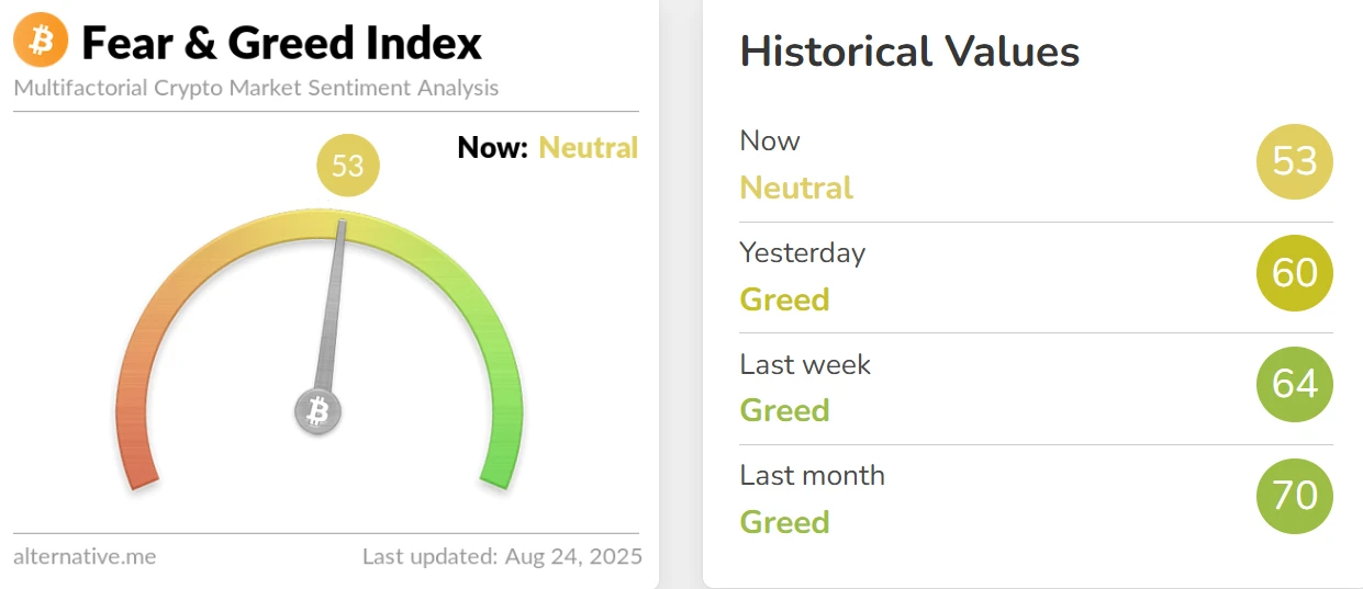 加密货币恐慌与贪婪指数降至53,市场情绪转为中性 2025-08-24 08:44:39 27 Alternative.me数据显示,8月24日加密货币恐慌与贪婪指数报53,较前一日的60下降7点,市场情绪由此前的"贪婪"等级转为"中性"状态。 上一篇:国泰海通证券:美联储或于9月降息25基点 全年最多两次 下一篇:五新钱包地址两天内接收19,332枚以太坊 相关文章 加密货币恐慌与贪婪指数降至73 市场情绪维持贪婪状态 加密货币恐慌与贪婪指数升至64,市场情绪转为贪婪 8月6日加密货币恐慌与贪婪指数降至54,市场情绪转为中性 加密货币恐慌与贪婪指数升至50,市场情绪转为中性 加密货币恐慌与贪婪指数降至53,市场情绪转为中性 加密货币恐慌与贪婪指数降至46,市场情绪转为恐慌 加密货币恐慌与贪婪指数升至55,市场情绪转为贪婪 加密货币恐慌与贪婪指数降至51,市场情绪转为中性 加密货币恐慌与贪婪指数9月5日降至48,市场情绪维持中性 加密货币恐慌与贪婪指数升至55,市场情绪转为贪婪状态 加密货币恐慌与贪婪指数降至53 市场情绪转为中性 加密货币恐慌与贪婪指数小幅攀升至53,市场情绪维持中性