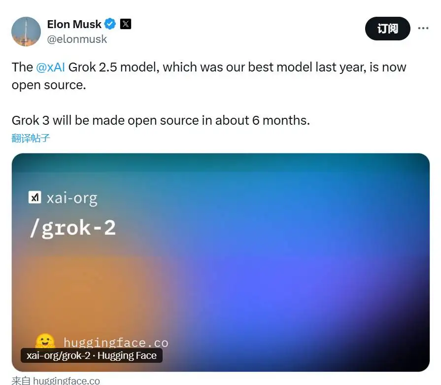 马斯克宣布Grok 2.5开源并预告Grok 3半年后发布 2025-08-24 09:40:12 24 马斯克于8月24日通过社交媒体宣布,Grok 2.5模型作为其团队去年研发的最优模型,目前已实现开源,并计划在约6个月后发布Grok 3的开源版本。 上一篇:某鲸鱼地址24小时内斥资200万美元购入178.9亿枚PEPE代币 下一篇:WLFI代币前十大地址累计投入7308万美元,分析师解析公募轮持仓情况 相关文章 马斯克宣布若“大而美法案”通过将成立新政党 特朗普宣布政府效率部将重点监管马斯克 马斯克宣布 Grok 4 发布直播时间 马斯克宣布7月24日重启Vine项目,采用人工智能技术 马斯克成2025上半年最大个人政治捐助者 向共和党注入超5500万美元 马斯克宣布Grok Imagine视频生成功能上线Android平台 马斯克宣布Grok 4 AI助手全球免费开放 提供每日限定查询额度 马斯克宣布Grok即将具备语音功能 马斯克驾临华尓街日报组建政党报道 马斯克宣布Grok 2.5开源并预告Grok 3半年后发布 特朗普之子预告重大公告发布 马斯克宣布Grok 5训练即将启动