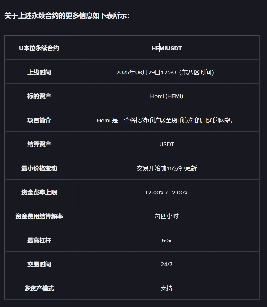 币安Alpha宣布将于2025年8月29日12:00(UTC+8)启动HEMI/USDT交易对,币安合约平台同步于当日12:30(UTC+8)上线HEMIUSDT永续合约,支持最高50倍杠杆。该平台成为首家上线HEMI合约交易及在币安Alpha展示该代币的交易平台。符合条件的用户可通过币安Alpha积分参与Booster空投活动,所获代币将在代币公开发行(TGE)后进入锁仓期,期间用户无法提取直至项目方解锁。官方特别提示用户需自行承担锁仓期流动性限制、市场波动及项目风险,所有活动参与均不承诺收益或流动性保障。