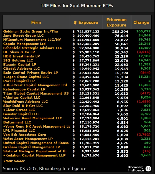 高盛成为以太坊ETF最大机构持有者,Jane Street和Millennium紧随其后 2025-08-28 11:50:15 24 8月28日披露的13F文件显示,高盛持有价值7.21亿美元的以太坊ETF,成为最大机构持有者;Jane Street和Millennium分别持有1.9亿美元和1.86亿美元。 上一篇:韩国警方逮捕虚拟货币投资诈骗团伙 涶案金额57亿韩元 下一篇:SOON基金会启动首轮空投活动,150万代币按交易量及NFT持有量分配 相关文章 BitMine成为全球最大以太币机构持有者,35天持仓达833,137枚 某长期持有者在Hyperliquid抛售比特币并建立以太坊多头头寸 某长期持有者抛售比特币转向以太坊做多,累计建仓6.5万枚ETH 资深比特币持有者完成400枚比特币向以太坊转换操作 比特币长期持有机构以太坊现货及合约头寸浮盈达1.61亿美元 比特币早期持有者转出6000枚BTC购入以太坊,累计持仓超27万ETH 高盛成为以太坊ETF最大机构持有者,Jane Street和Millennium紧随其后 比特币早期持有者再度活跃:转手1,000枚BTC购入现货以太坊 比特币早期持有者向HyperLiquid大额存款并兑换以太坊 8月以太坊持有者行为分化:巨鲸止购,大型鲸鱼重启积累 某以太坊早期持有者地址向Bybit转入2200枚ETH,或计划抛售 Caliber完成650万美元Chainlink代币收购,成为最大公开持有者之一