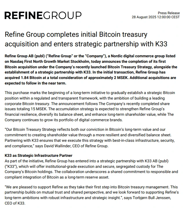瑞典上市公司Refine Group AB启动比特币储备计划,首购1.84枚比特币并与K33达成合作 2025-08-28 21:05:32 25 瑞典上市公司Refine Group AB正式实施比特币储备策略,完成首笔1.84枚比特币采购,并与加密研究机构K33建立战略合作关系。该动作发生于8月28日。 上一篇:美股上市公司LiveOne增持200万美元BTC,总持仓达34.2枚 下一篇:法国加密货币相关暴力案件激增 专家警示隐秘报案风险 相关文章 澳大利亚上市公司 Opyl 购入约 2 枚比特币,采用比特币储备策略应对财务困境 日本上市公司 Convano 启动比特币储备计划,拟购入 270 万美元 BTC 印度上市公司Jetking董事会批准定向增发计划以扩充比特币储备 瑞典上市公司Fragbite Group完成首批4.3枚比特币采购,启动比特币金库业务 瑞典上市公司H100 Group增持60.6枚比特币,总持仓达732.2枚 瑞典上市公司H100 Group新增购入45.8枚比特币,累计持有809枚 瑞典上市公司Fragbite Group计划年底前增持比特币至100枚 美国财政部承认比特币储备地位,战略储备计划启动 比特币财库公司BSTR拟通过与CEPO合并在纳斯达克上市,计划增持比特币至5万枚以上 Amdax公司宣布推出比特币储备实体AMBTS 计划长期持有21万枚比特币 瑞典上市公司Refine Group AB启动比特币储备计划,首购1.84枚比特币并与K33达成合作 美股上市公司Prenetics确认持有2610万美元比特币储备 启动三年期增持计划
