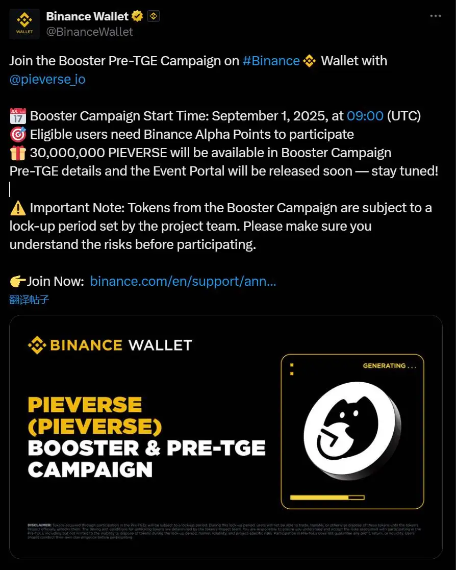 币安钱包与Pieverse启动Booster及Pre-TGE活动,发行3000万枚PIEVERSE代币 2025-08-29 18:58:35 22 币安钱包与Pieverse宣布将于2025年9月1日09:00(UTC)启动Booster及Pre-TGE活动,该活动将发行3000万枚PIEVERSE代币。参与资格要求用户持有币安积分(Alpha Points),但具体积分门槛尚未披露。 上一篇:CoinShares 2025年Q2净利润3240万美元 资产管理规模激增至35亿美元 下一篇:美元指数8月延续跌势,华尔街预期年内下行趋势持续 相关文章 币安钱包将于7月7日启动PAL代币独家TGE活动 币安上线 CROSS 代币并启动空投活动 币安上线 TANSSI 代币并启动空投活动 币安宣布启动Bitlayer(BTR)钱包Booster及预售代币活动 币安钱包启动AIBOT代币独家TGE活动 8月14日开放认购 币安Alpha上线DORA代币并启动空投活动 币安钱包启动Openledger首期Booster活动 提供200万枚OPEN空投奖励 币安钱包与Pieverse启动Booster及Pre-TGE活动,发行3000万枚PIEVERSE代币 币安钱包联合Aspecta推出BuildKey机制代币发行活动 币安上线DeAgentAI代币并启动空投活动 币安钱包将独家启动第38期TGE活动 上线JoJo World代币 币安启动Alpha积分用户代币空投活动