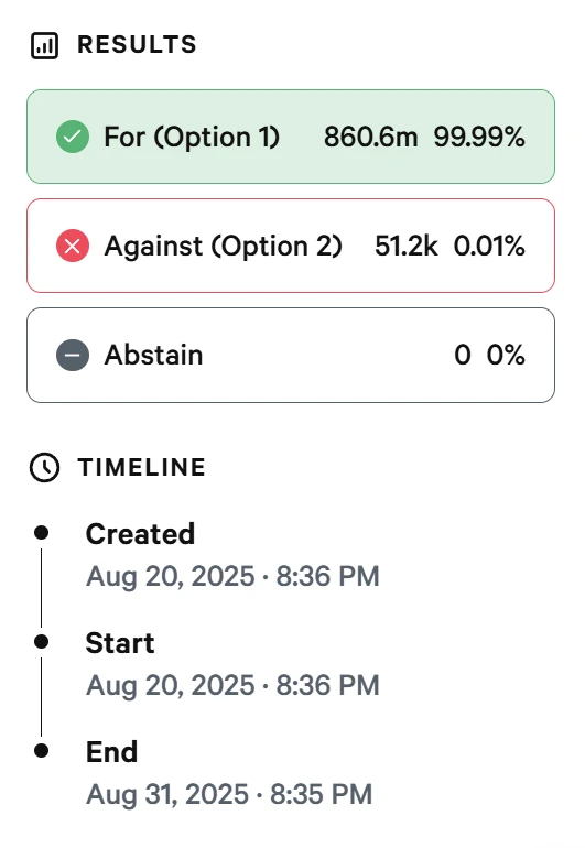 Sonic Labs治理提案高票通过 美国市场扩张与代币分配方案落地 2025-09-01 09:52:23 23 9月1日,Snapshot页面披露,Sonic Labs的“美国市场扩张和传统金融采纳”治理提案以99.99%支持率通过,批准发行代币用于5000万美元ETF配额、1亿美元纳斯达克PIPE开发及1.5亿S代币分配至Sonic USA。该提案同步更新燃烧机制:FeeM交易将90%分配给建设者、5%给验证者、5%销毁;非FeeM交易则50%销毁、50%分配给验证者。Sonic USA计划设立首席执行官职位并开设纽约办公室,专注机构采用与合规发展。 上一篇:特朗普称美国物价显著回落 关税收入达数万亿美元 下一篇:加密货币投资者疑似清仓4720枚ETH 账面利润或达951万美元 相关文章 Linea 计划7月底公布代币经济学及治理方案 Polymarket收购交易所,计划重返美国市场 Aspecta公布代币分配方案:45%用于社会及生态发展 Tether CEO宣布重返美国市场,专注机构支付解决方案 TikTok估值达3300亿美元,美国市场仍未盈利 Sonic Labs治理提案高票通过 美国市场扩张与代币分配方案落地 WFLI代币分配方案披露:初始流通量或达6.4% WLFI协议治理提案:用自有流动性费用回购销毁代币 Polymarket获CFTC无异议函重返美国市场 Anoma公布代币经济学分配方案:总供应量100亿枚 Polymarket计划100亿美元估值融资并重返美国市场 World Liberty Financial社区高票通过代币销毁提案,多链机制正式落地