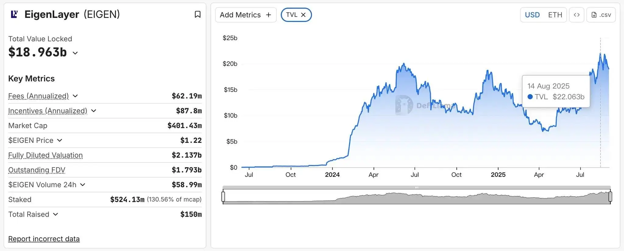 EigenLayer TVL八月突破220亿美元创新高,ETH质押与价格双轮驱动 2025-09-03 15:42:03 18 链上分析师Ai姨(@ai_9684xtpa)监测显示,EigenLayer TVL于8月突破220亿美元历史峰值。数据显示主要驱动因素包括ETH储备机构通过公开市场采购ETH进行质押套利,以及8月ETH价格显著上涨。值得注意的是,ETHZilla同步披露将1亿美元ETH注入EtherFi再质押协议的部署计划。 上一篇:Matrixport:黄金突破3400美元,与比特币同步配置趋势显现 下一篇:Tastylive主管分析特朗普关税政策对市场的影响 相关文章 BTC价格突破121000美元,再创新高 BNB价格突破847美元再创新高 BTC价格突破124000美元再创新高 OKB价格创新高,市值突破50亿美元跃居加密货币第37位 以太坊价格创新高突破5860亿美元市值,位列全球科技企业第25位 EigenLayer TVL八月突破220亿美元创新高,ETH质押与价格双轮驱动 黄金价格创新高推动代币化市场突破25亿美元 USDT市值突破1700亿美元再创新高 PUMP代币价格创新高 市值突破26亿美元 谷歌市值突破3万亿美元创新高 币安稳定币储备突破400亿美元创新高 BNB价格突破1000美元再创新高