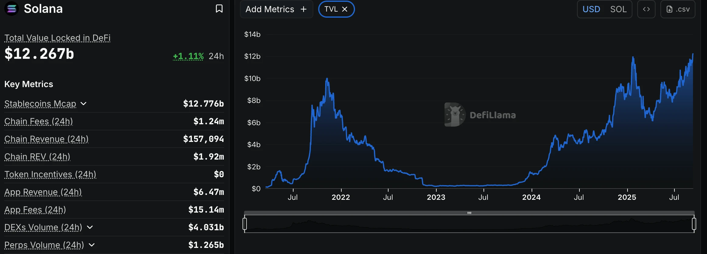 Solana市值逼近1200亿美元 DeFi总锁仓量创新高 2025-09-10 17:16:55 17 Solana市值逼近1200亿美元,24小时上涨0.94%,同时DeFi总锁仓量达122.67亿美元创新高。 上一篇:香港稳定币监管回应及发牌制度进展 下一篇:币安Alpha上线Unibase交易及空投活动 相关文章 JustLend DAO总锁仓量达64.4亿美元 以太坊全网合约持仓量突破600亿美元创历史新高 OKB价格创新高,市值突破50亿美元跃居加密货币第37位 以太坊价格创新高突破5860亿美元市值,位列全球科技企业第25位 黄金价格创新高推动代币化市场突破25亿美元 Solana市值逼近1200亿美元 DeFi总锁仓量创新高 Solana生态DeFi总锁仓价值突破130亿美元创新高 SOL合约持仓量创新高 币安领跑市场 USDT市值突破1700亿美元再创新高 PUMP代币价格创新高 市值突破26亿美元 谷歌市值突破3万亿美元创新高 币安稳定币储备突破400亿美元创新高
