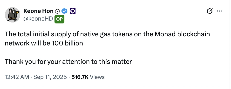 Monad联合创始人公布链上原生Gas代币供应量为1000亿枚 2025-09-11 11:19:23 34 Monad联合创始人Keone Hon于9月11日在X社交平台披露,该链原生Gas代币的初始总供应量设定为1000亿枚。 上一篇:Scroll DAO暂停治理机制,领导人辞职引发社区担忧 下一篇:比特币核心软件是什么?如何更新节点版本? 相关文章 BitMEX联合创始人多渠道购入150.5万美元ENA代币 Aspecta 公布代币 ASP 总供应量 10 亿枚 Delphinus Lab公布代币经济模型:总供应量10亿枚,空投占比2.5% USDe供应量突破60亿枚,刷新历史纪录 Pump.fun联合创始人:PUMP空投时间表及细节将尽快公布 Sky联合创始人Rune利用质押奖励回购SKY代币 Linea公布代币经济模型:720亿总供应量,85%用于生态发展 Bitlayer发布BTR代币经济学方案 总供应量10亿枚 World Liberty Financial公布$WLFI代币发行计划,初始流通供应量约246.69亿枚 Anoma公布代币经济学分配方案:总供应量100亿枚 Monad联合创始人公布链上原生Gas代币供应量为1000亿枚 BitMEX联合创始人被指通过场外交易减持ETHFI代币