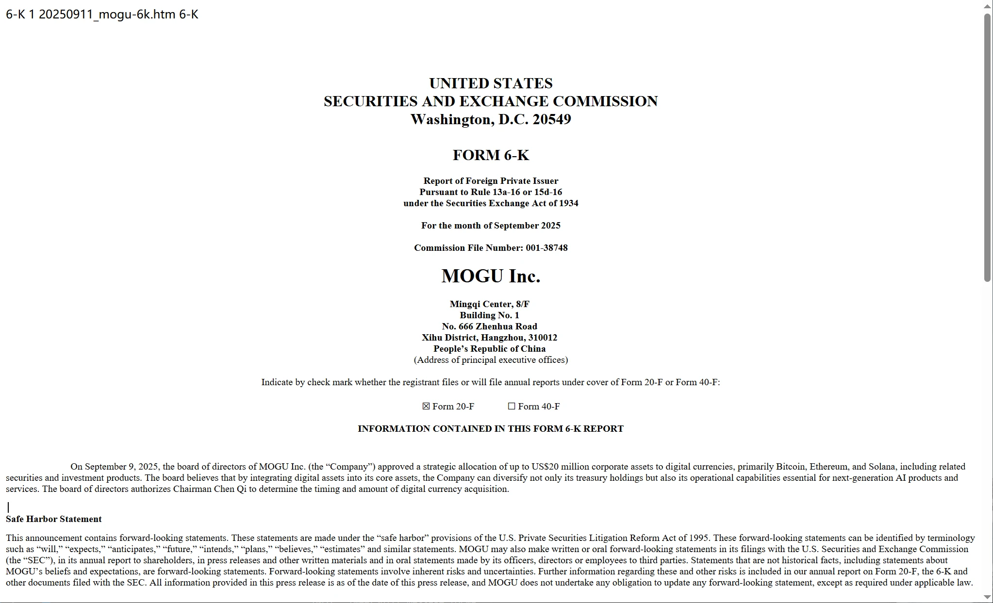 蘑菇街计划投资2000万美元于数字货币领域,董事长获采购决策权 2025-09-11 19:36:42 24 蘑菇街(NYSE: MOGU)宣布,董事会已于9月9日通过战略性资产配置方案,计划将至多2000万美元公司资产投入数字货币领域,涵盖Bitcoin、Ethereum、Solana及相关证券和投资产品。该决策旨在通过数字资产整合实现资金储备多元化,并提升对下一代人工智能业务的支撑能力。董事长Chen Qi已被授予数字货币采购时机与金额的决策权限。 上一篇:第三届亚洲愿景论坛在新加坡开幕 数字资产发展引热议 下一篇:Bitget推出LINEA合约新币与CandyBomb双活动 最高奖励4230 LINEA 相关文章 华兴资本计划两年内注资1亿美元拓展Web3与数字资产领域 巨鲸投资者卖出2000枚ETH,亏损32.4万美元 Mogo董事会批准5000万美元比特币投资计划 链上投资者在TRUMP和ZEREBRO获利超2000万美元后10日内买入27.6万美元AVA代币 某投资者清仓2720枚ETH获利67.7万美元 SEALSQ Corp计划设立3000万美元加密货币投资基金 ETH ICO早期投资者104美元投资斩获148万美元回报 孙宇晨计划投资1000万美元于加密相关股票 蘑菇街计划投资2000万美元于数字货币领域,董事长获采购决策权 蘑菇街股价飙升200%并配置2000万美元数字货币资产 以太坊早期投资者大额抛售,获利超950万美元 Hyperscale Data子公司启动500万美元比特币采购计划 执行董事长强调1亿美元储备战略实施