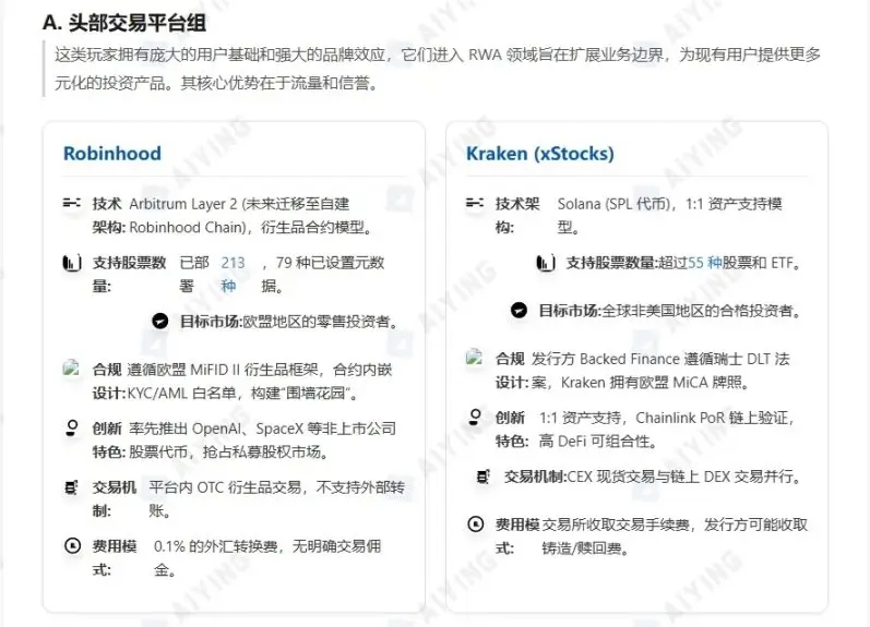 接着提出xStocks与Robinhood作为两种典型范式代表。xStocks由Backed Finance发行,在Kraken等交易所交易,走的是“开放DeFi”路径,其代币在法律上直接或间接代表对真实股票的所有权或权益,追求资产真实性与透明度。例如,其通过多层法律实体与清晰监管框架来规避法律风险,且已支持多种股票和ETF并在交易上展现出一定活力。