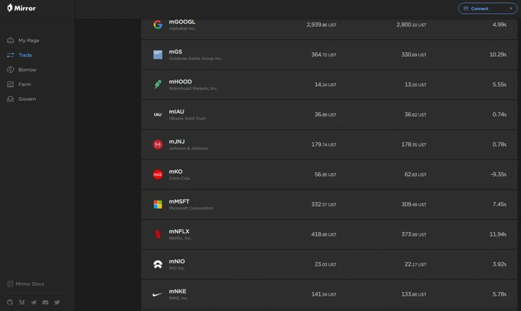 Mirror协议的核心在于利用链上合成资产来追踪现实世界里美股的股价,由此产生了mAssets这类资产。所谓的mAssets,是通过智能合约和预言机模拟股票价格的代币,持币者并不持有实际股票,仅作为“链上的影子”来追踪价格波动。例如mAAPL(苹果)、mTSLA(特斯拉)、mSPY(标普500 ETF)等,它们依靠Band Protocol的去中心化预言机来获取实时美股数据。这种机制在当时为用户提供了一种无需直接持有实际股票即可参与美股价格波动的方式,具有一定的创新性,但也因其不持有实际股票的特性,埋下了潜在风险。