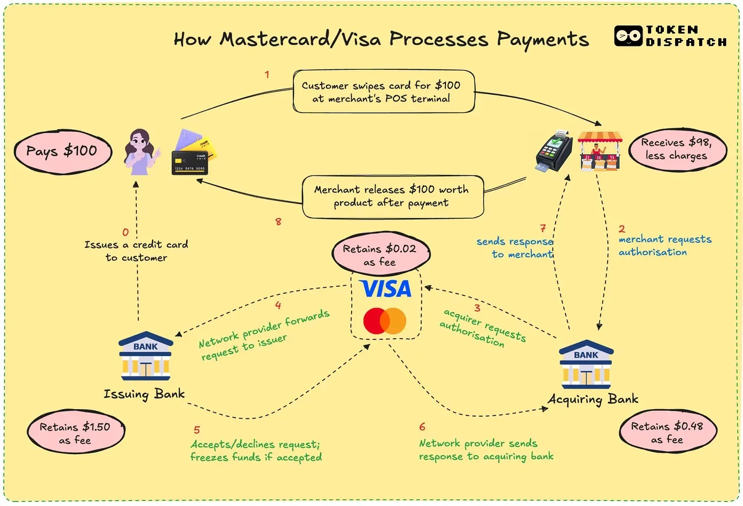 在这一四方模式下,每笔交易通常需1至3天完成结算,且要经过多家机构,商家才能收到款项。例如,2023年全球约57%的非现金交易通过借记卡或信用卡完成,均遵循此流程。