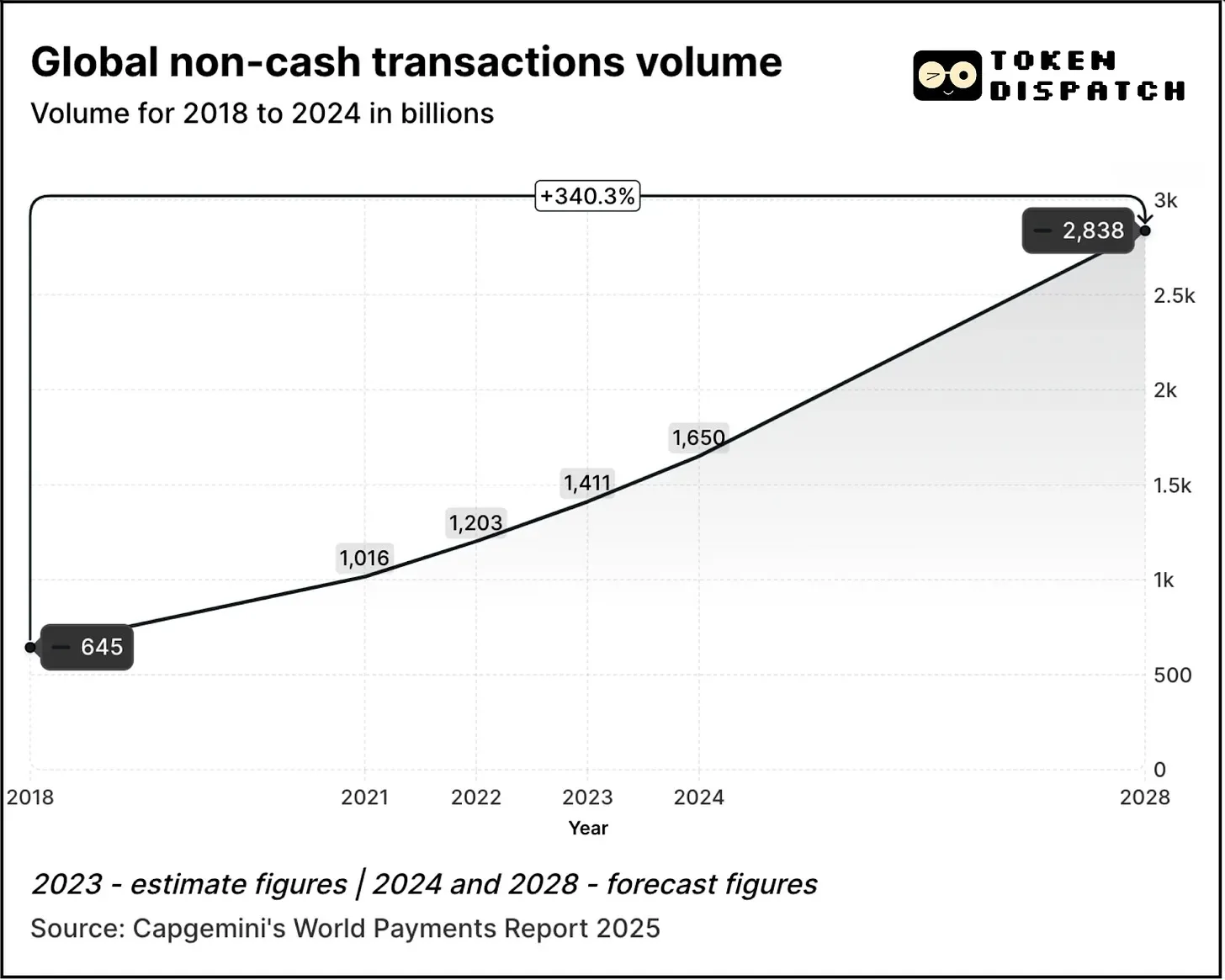 该支付体系的收入模型围绕交易费用分配展开。商家在每笔交易中需支付约2-3%的交易价值作为费用,这些费用会在发卡银行、收款银行、处理机构和卡网络之间进行分配。以2024年为例,Mastercard和Visa仅从支付服务就分别创造了170亿美元和160亿美元的收入,且数字交易量呈持续增长态势,如从2018年的6450亿增长到2024年的1.65万亿,预计到2028年还将从2024年水平增长70%,达到2.84万亿。