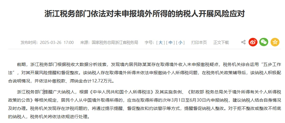 网传浙江陈某某因交易虚拟货币获利未主动申报纳税,被国家税务总局浙江省税务局追征个人所得税及滞纳金共计12.72万元。2025年3月26日,浙江省税务局官网相关消息提及在政策辅导后,该纳税人积极配合说明情况。