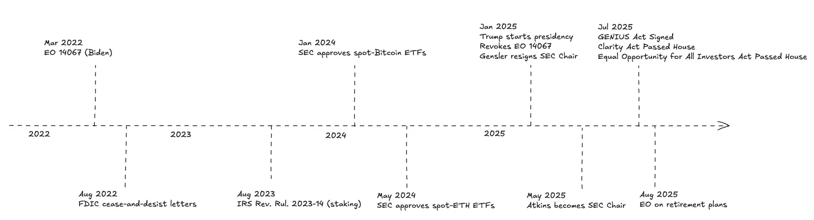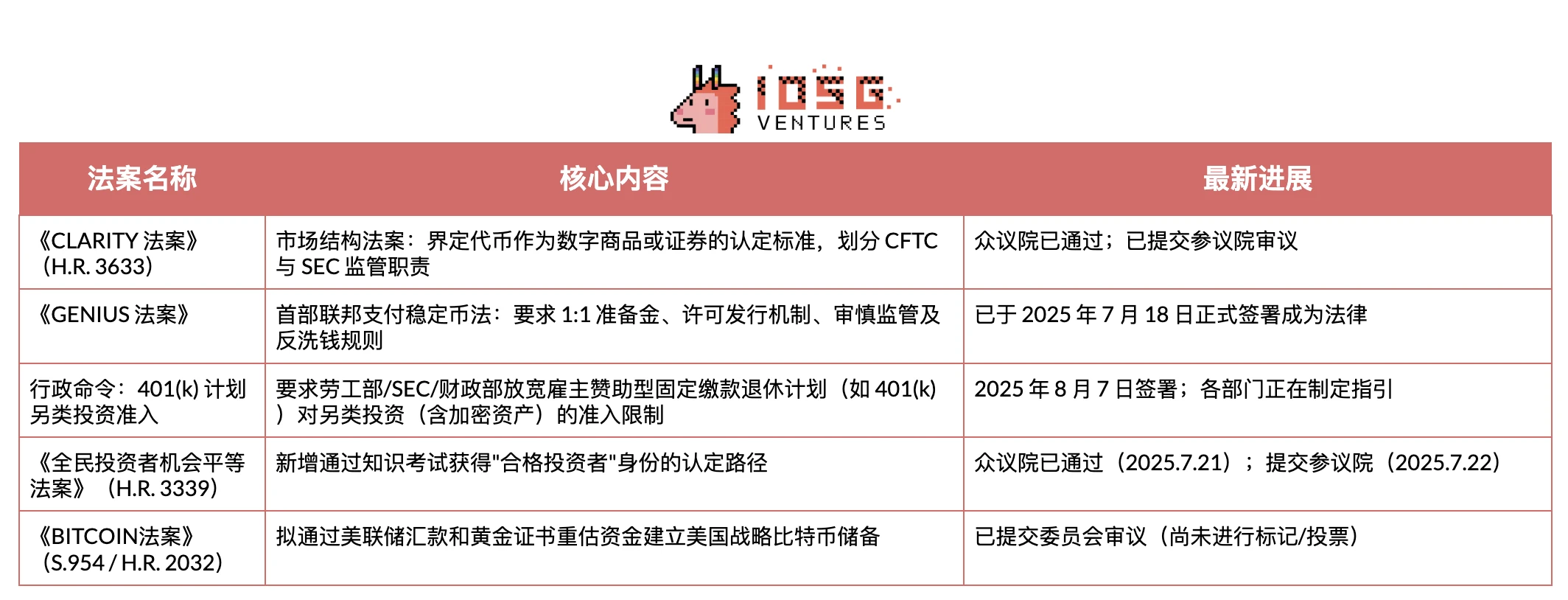 过去三年,美国对加密货币的监管立场发生显著转变,从早期以执法为主的相对不友好态度,转向以规则制定为先的建设性监管模式。这种转变不仅推动加密货币广泛应用,也成为行业下一阶段增长的关键催化剂。监管模式的转型,对行业增长意义重大。,《GENIUS 法案》已颁布,《CLARITY 法案》获众议院通过,还有行政命令推动退休计划对加密资产开放投资等,这些核心法案与政策动向值得关注。