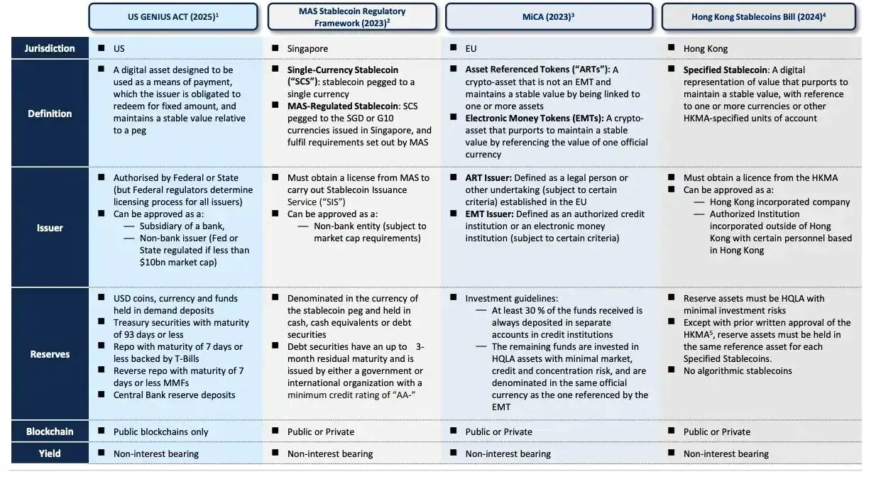 2025年7月,美国颁布GENIUS法案,此为首部全面规范稳定币的联邦法律。该法案将发行资格限定于受监管实体,明确除许可支付稳定币发行方外,任何主体不得在美国发行支付稳定币。发行方须持有100%储备资产,且仅限于美元或美联储银行存款、93天以内短期美国国债、国债担保的隔夜回购协议三类。如此规定旨在保障稳定币价值稳定,降低兑付风险。